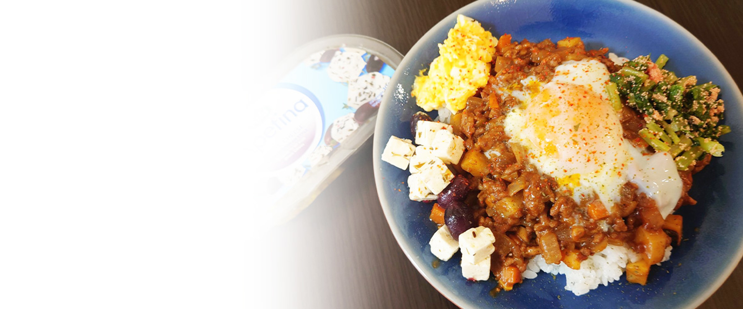 7.皿にご飯を盛り、6のルーを上からかけたら、アペティーナホワイト キューブ&オリーブ、温泉卵、その他お好みのトッピングをのせる。