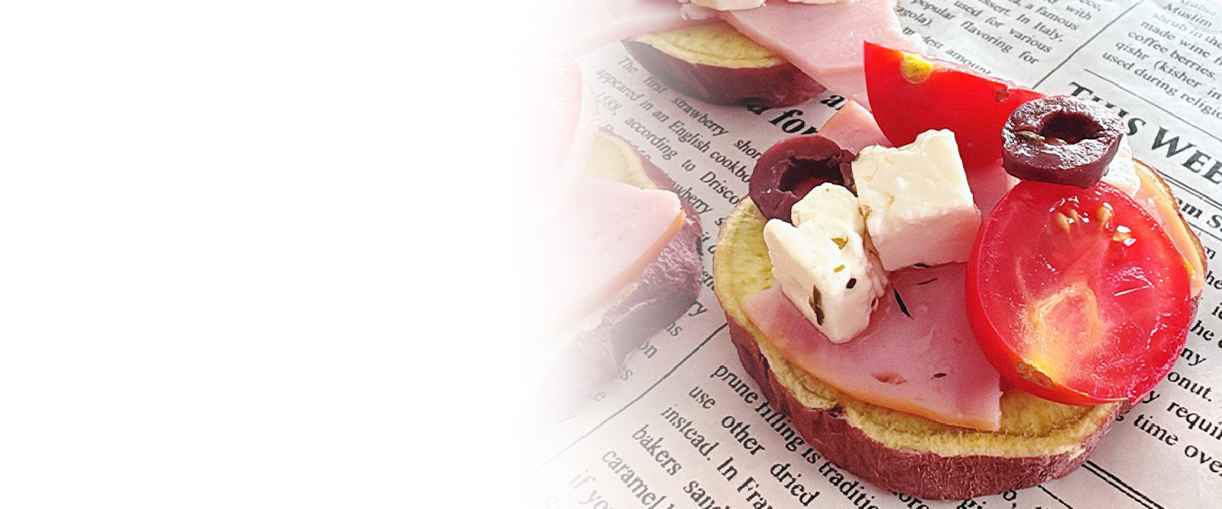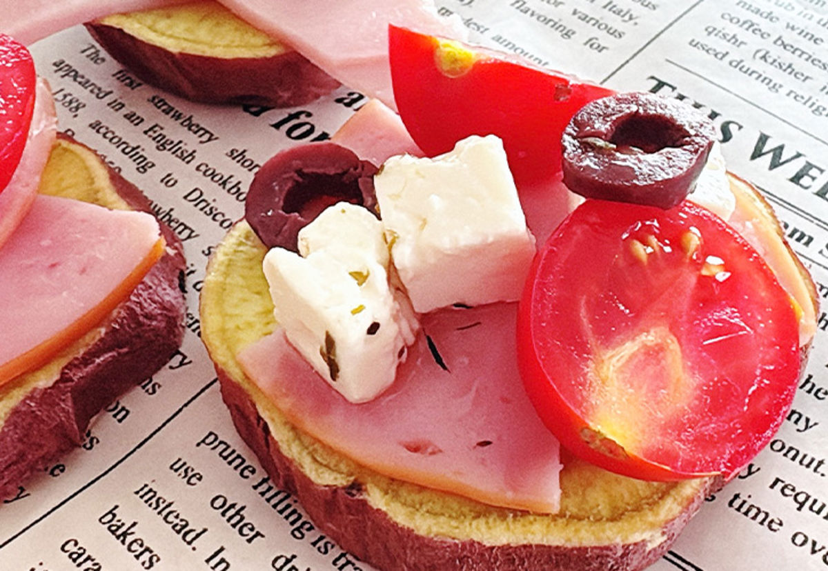 3.1のさつまいもの粗熱がとれたら、さつまいもの上にロースハムを敷いて、チーズ・オリーブ・ミニトマトをのせて完成。